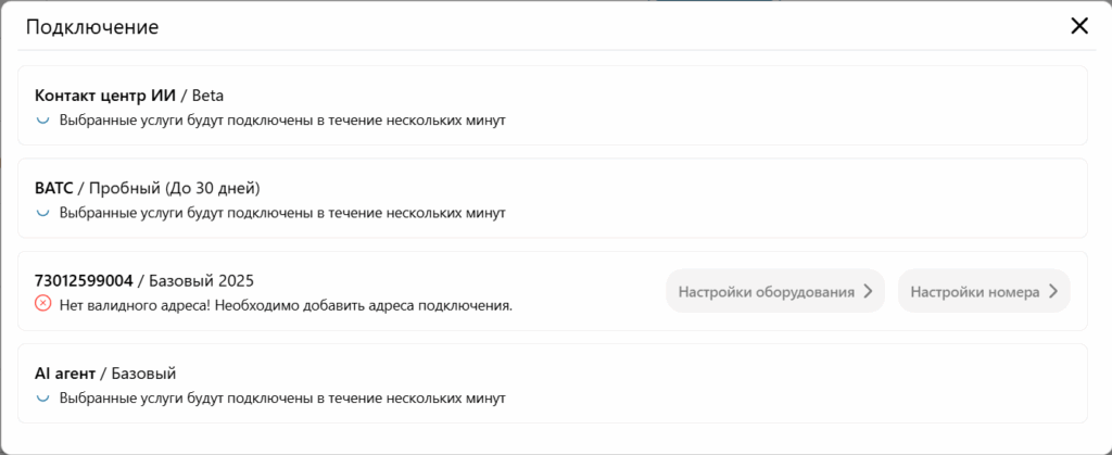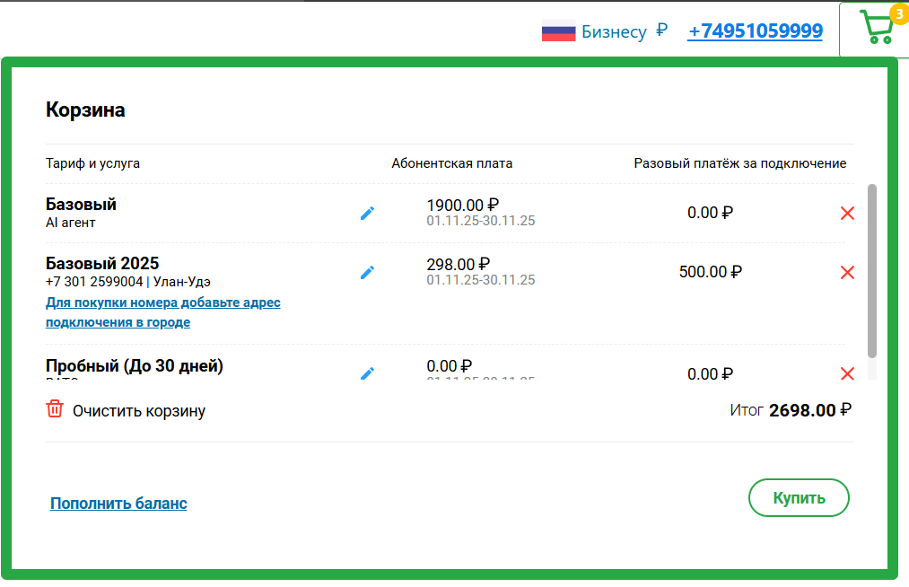 - После нажатия кнопки подключить, голосовой ИИ агент добавится в корзину. Однако, для его работы необходимы дополнительные продукты: Номер телефона, Контакт-центр ИИ и Виртуальная АТС. В той же витрине можно выбрать красивый номер и выгодныйй тариф.